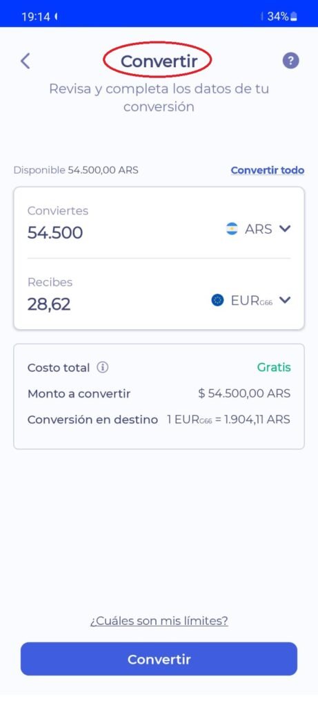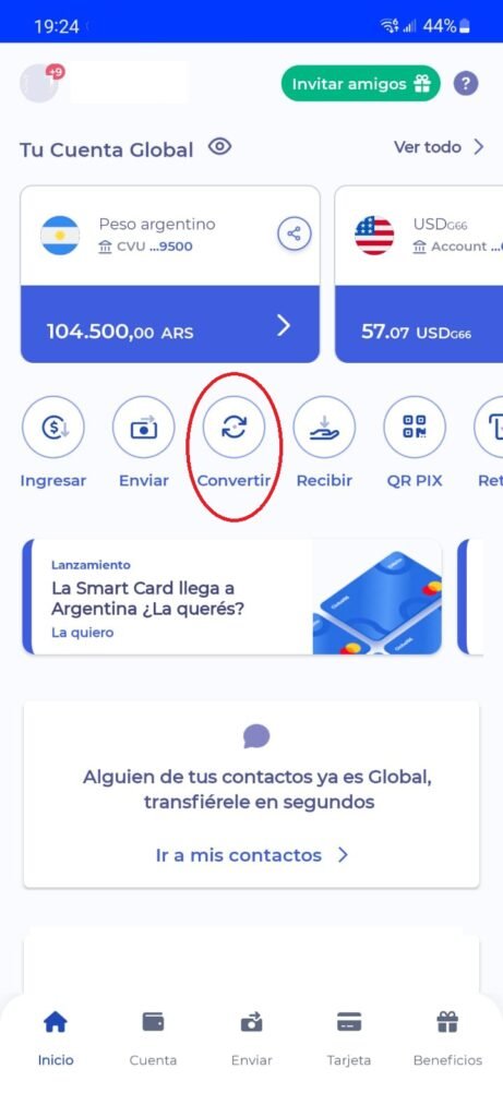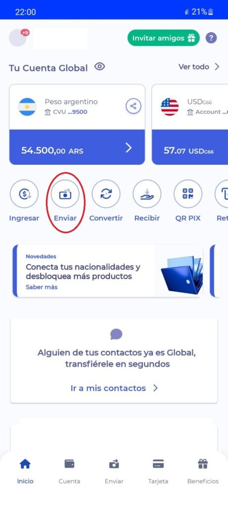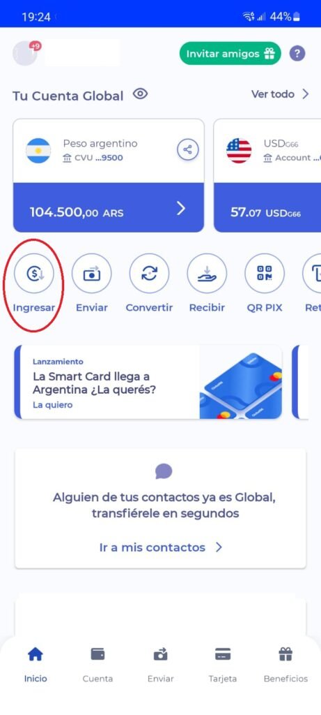 Cargue pesos argentinos mediante transferencia local, haciendo click en el botón “Ingresar” (circulo rojo de la imagen) entre alguna billetera virtual que posea hacia su nueva cuenta en pesos de global, se hace una transferencia normal interna entre cuentas propias. O bien le puede enviar cualquier tercero el monto en pesos argentinos necesarios para solicitar el servicio de gestión consular integral.
