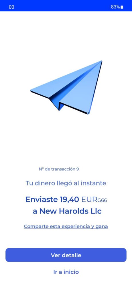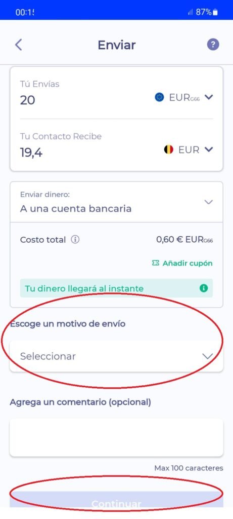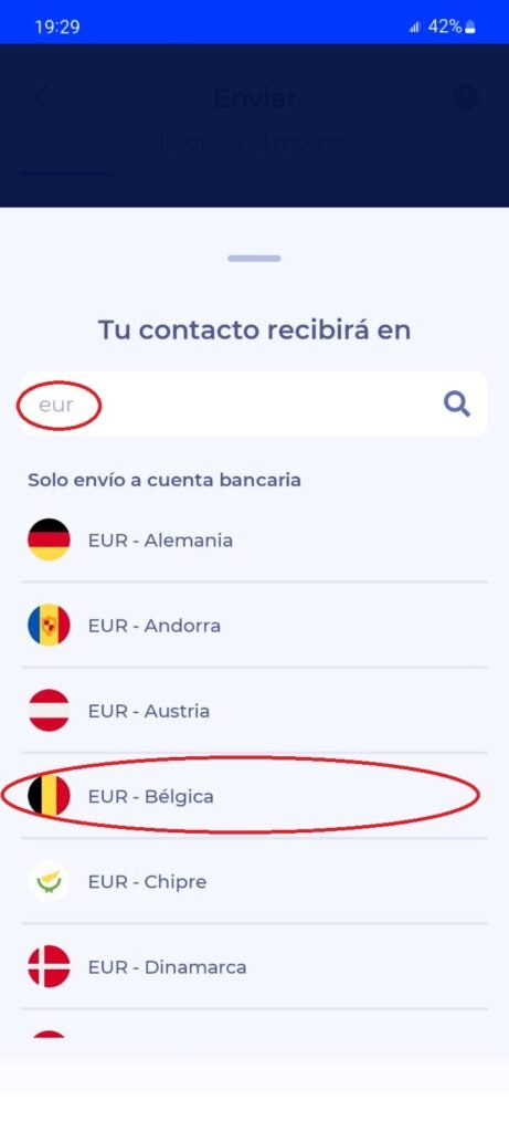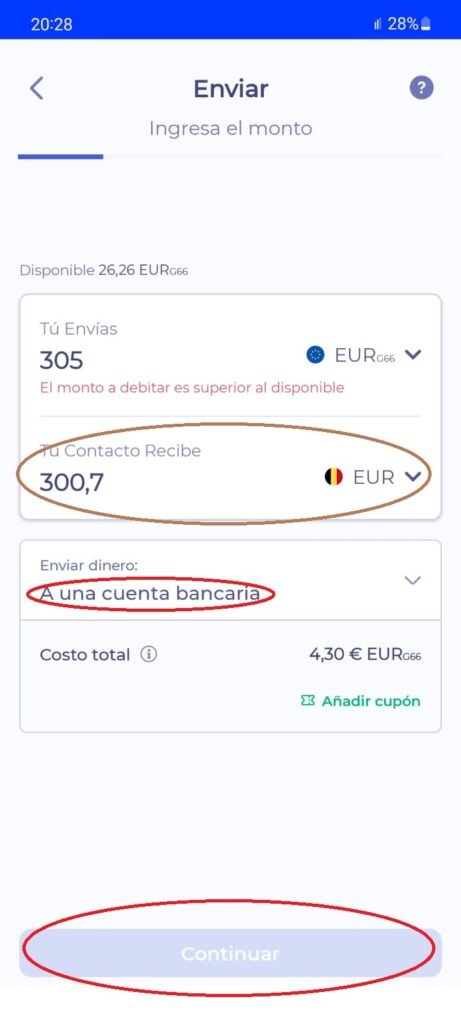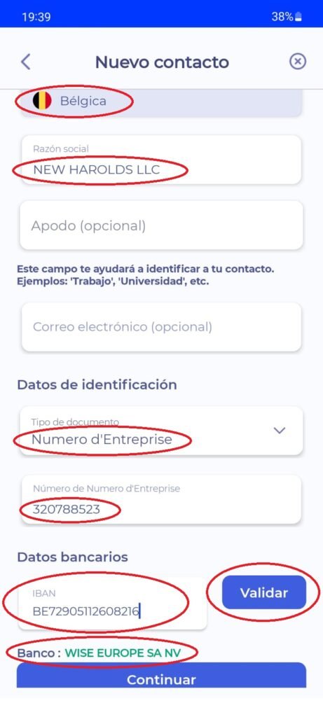 En “Nuevo contacto” > “Bélgica” > “Razón social: NEW HAROLDS LLC” > “Tipo documento: Numero d’Entreprise” > “Número de d’Entreprise: 320788523” > “IBAN: BE72 9051 1260 8216” > “Validar: Banco: WISE EUROPE SA NV” > “Continuar”
